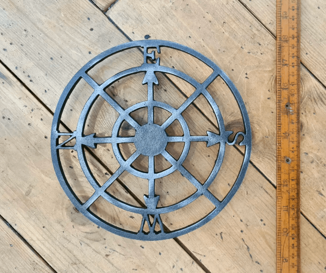 A decorative circular trivet featuring a compass design, made from solid cast iron with an antique finish. Measuring 200mm, it’s perfect for protecting surfaces from hot cookware while adding rustic style.