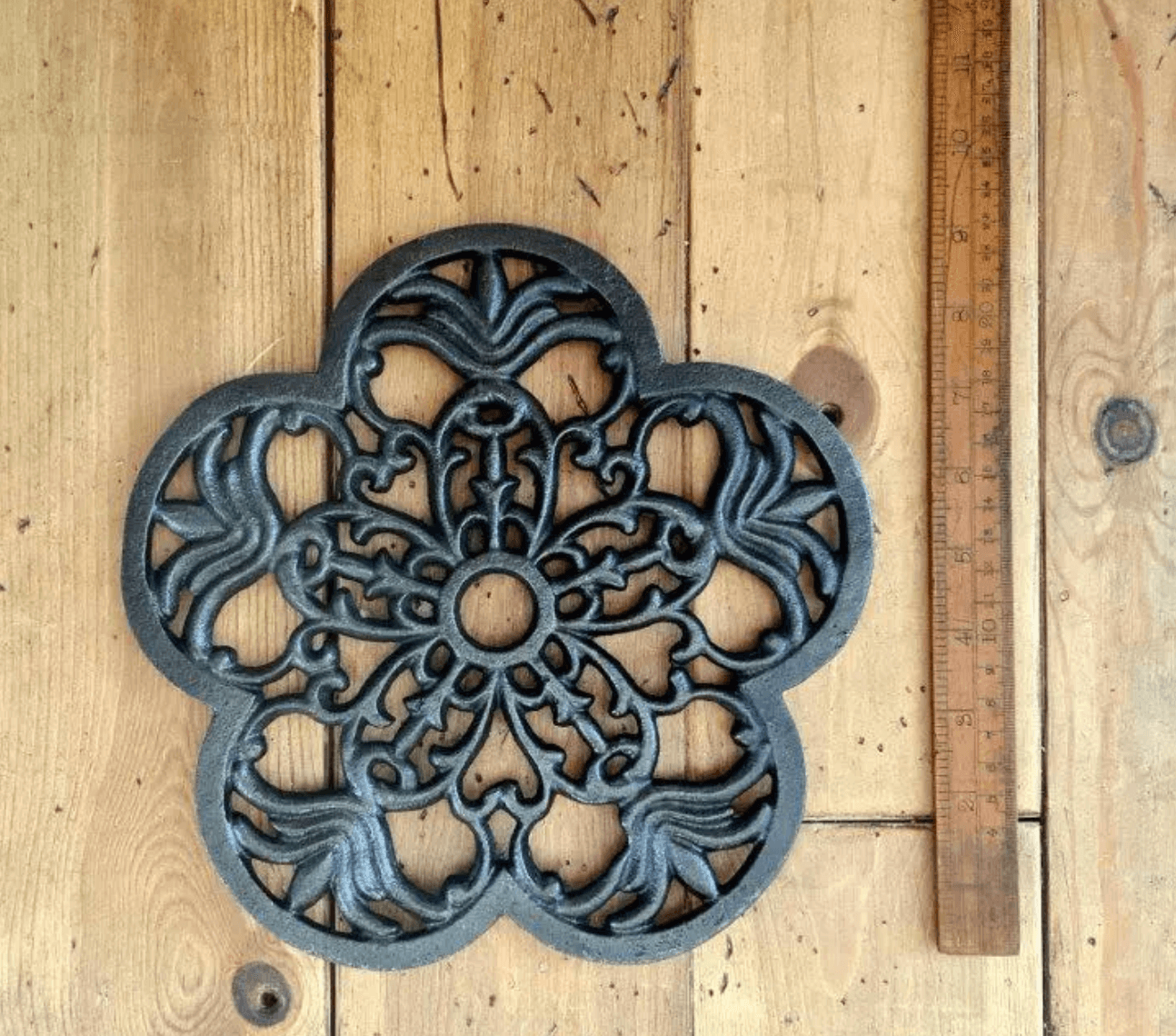 Made using traditional casting methods, the trivet offers excellent durability and heat resistance, making it ideal for placing hot pots, pans, or serving dishes. The open flower design not only creates a visually appealing feature but also helps disperse heat effectively.